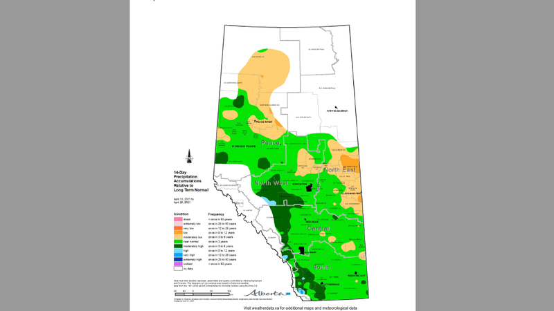 EDMONTON — The latest moisture situation update from Alberta Agriculture and Forestry, shows that much of southern Alberta has received near-normal precipitation in the two-week period ending on April 26.